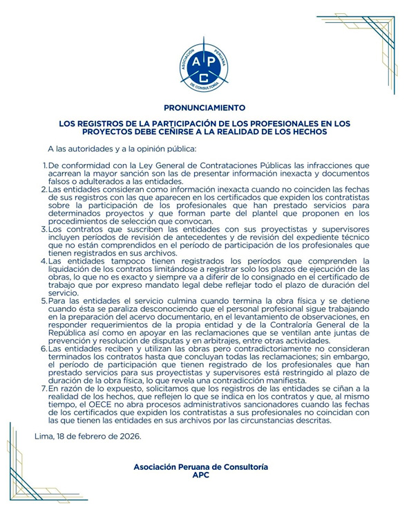 La Asociación Peruana de Consultoría (APC) hace de conocimiento público su preocupación por las discrepancias existentes entre los registros administrativos de las entidades públicas y la real participación de los profesionales en los proyectos. Se ha identificado la...