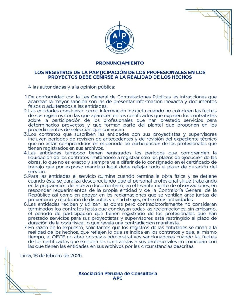 La Asociación Peruana de Consultoría (APC) hace de conocimiento público su preocupación por las discrepancias existentes entre los registros administrativos de las entidades públicas y la real participación de los profesionales en los proyectos.